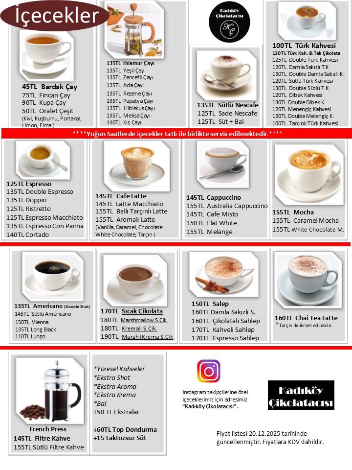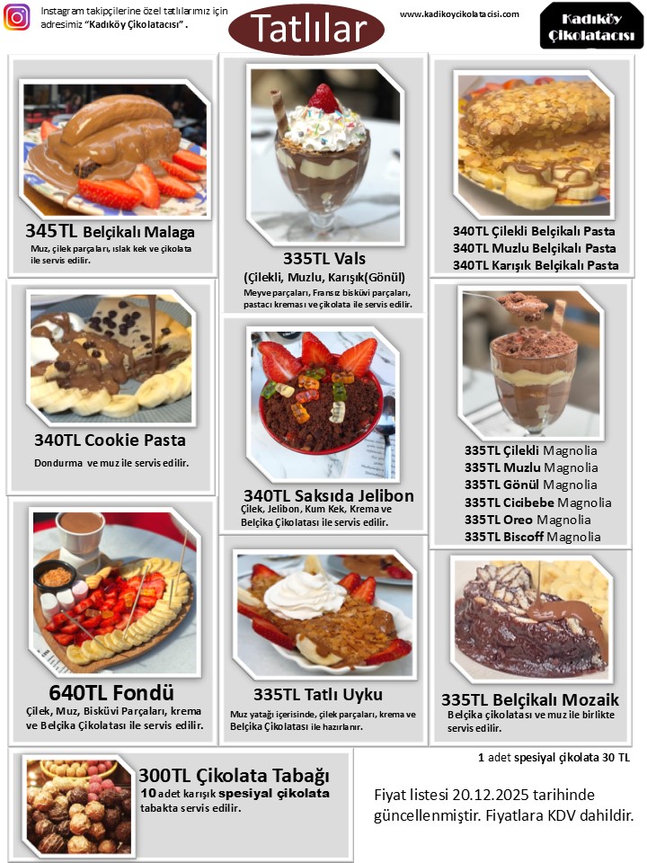 Kadıköy Çikolatacısı olarak çikolatanın ve kahvenin zarif dünyasında unutulmaz bir deneyim sunmayı amaçlıyoruz. Eşsiz lezzetlerimizle sizlere keyifli anlar yaşatmayı hedefliyoruz. Yöresel kahve çeşitlerimiz ve özgün çikolatalarımızla tasarlanmış butik mekanımızda, her bir yudumda kaliteyi ve lezzeti keşfetmeye davet ediyoruz. Vizyonumuz, çikolata ve kahve sektöründe, sunduğumuz tüm ürün ve hizmetlerle sektördeki lider konumumuza ulaşmak ve bunu sürdürülebilir bir başarıya dönüştürmektir. Misyonumuz, yenilikçi yaklaşımımızla, lezzeti ön planda tutarak, her biri özenle hazırlanmış unutulmaz tatlar sunan bir marka olmaktır. INSTAGRAM@kadikoycikolatacisi